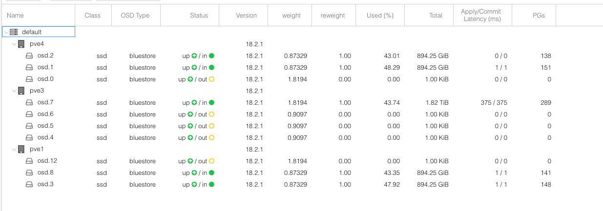 Les OSD représentent chacun un disque sur Ceph, ceux qui sont actifs sont ceux en “in” (les “out” sont en cours de décomissionnement), et la “Apply/Commit latency” indique la latence d’écriture sur les SSD en ms.